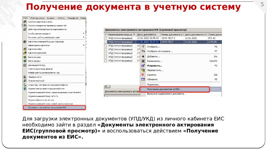 Получение документа в учетную систему Январь 2020 Для загрузки электронных документов (УПД/УКД) из личного кабинета ЕИС необходимо зайти в раздел «Документы электронного актирования ЕИС(групповой просмотр)» и воспользоваться действием «Получение документов из ЕИС».