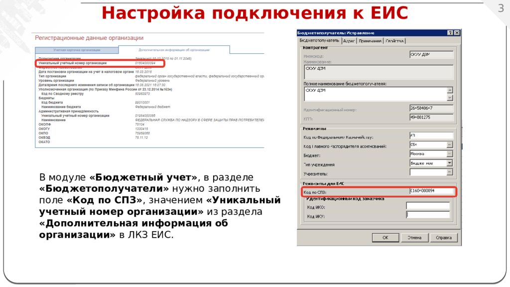 Настройка подключения к ЕИС Январь 2020 В модуле «Бюджетный учет», в разделе «Бюджетополучатели» нужно заполнить поле «Код по СПЗ», значением «Уникальный учетный номер организации» из раздела «Дополнительная информация об организации» в ЛКЗ ЕИС.