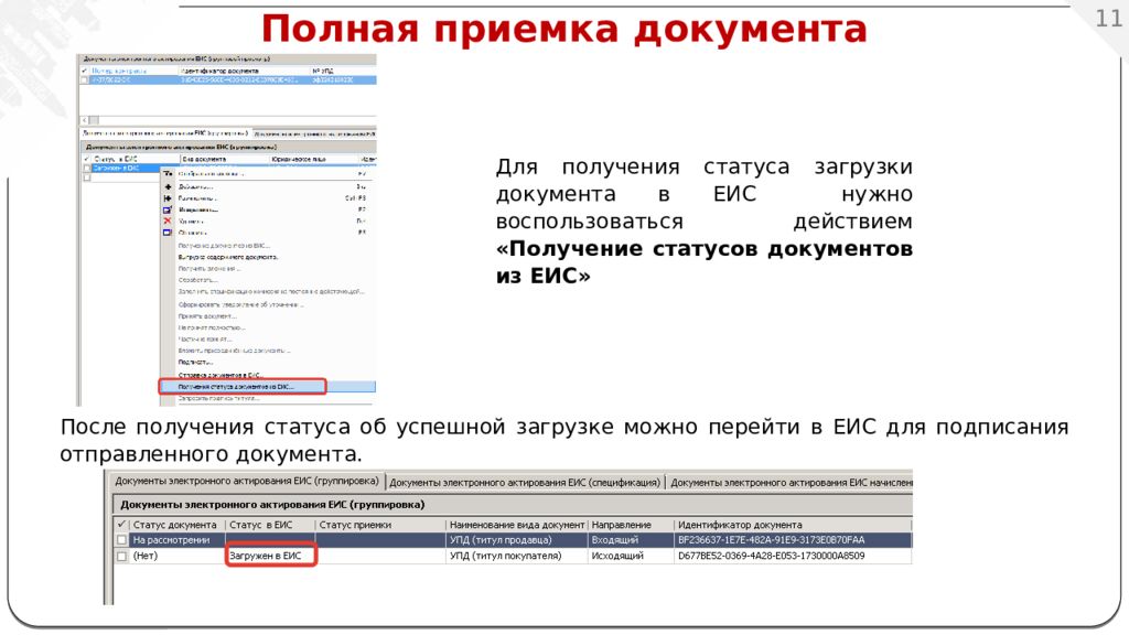 Полная приемка документа Январь 2020 Для получения статуса загрузки документа в ЕИС нужно воспользоваться действием «Получение статусов документов из ЕИС» После получения статуса об успешной загрузке можно перейти в ЕИС для подписания отправленного документа.