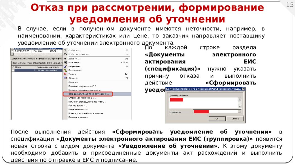Отказ при рассмотрении, формирование уведомления об уточнении Январь 2020 В случае, если в полученном документе имеются неточности, например, в наименовании, характеристиках или цене, то заказчик направляет поставщику уведомление об уточнении электронного документа. По каждой строке раздела «Документы электронного актирования ЕИС (спецификация)» нужно указать причину отказа и выполнить действие «Сформировать уведомление об уточнении». После выполнения действия «Сформировать уведомление об уточнении» в спецификации « Документы электронного актирования ЕИС (группировка)» появится новая строка с видом документа «Уведомление об уточнении». К этому документу необходимо добавить в присоединенные документы акт расхождений и выполнить действия по отправке в ЕИС и подписание.