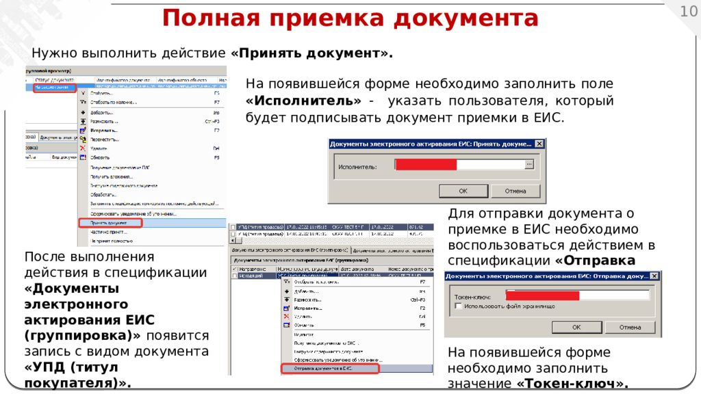 На появившейся форме необходимо заполнить поле «Исполнитель» - указать пользователя, который будет подписывать документ приемки в ЕИС. После выполнения действия в спецификации «Документы электронного актирования ЕИС (группировка)» появится запись с видом документа «УПД (титул покупателя)». Для отправки документа о приемке в ЕИС необходимо воспользоваться действием в спецификации «Отправка документов в ЕИС». На появившейся форме необходимо заполнить значение « Токен-ключ ». Нужно выполнить действие «Принять документ». Полная приемка документа