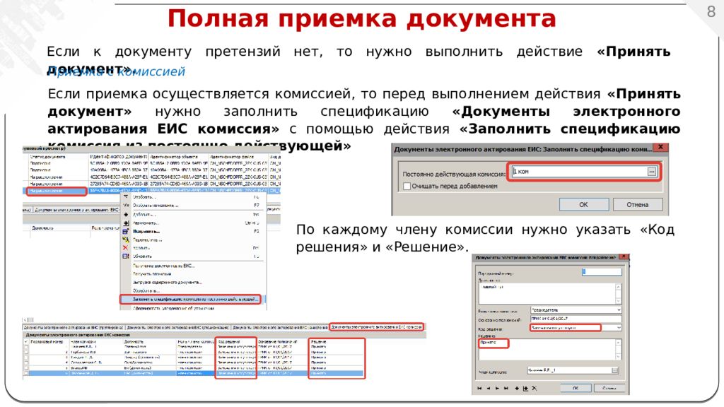 Полная приемка документа Январь 2020 Если к документу претензий нет, то нужно выполнить действие «Принять документ». Если приемка осуществляется комиссией, то перед выполнением действия «Принять документ» нужно заполнить спецификацию «Документы электронного актирования ЕИС комиссия» с помощью действия «Заполнить спецификацию комиссия из постоянно действующей» По каждому члену комиссии нужно указать «Код решения» и «Решение». Приемка с комиссией