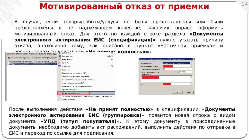 Мотивированный отказ от приемки Январь 2020 В случае, если товары/работы/услуги не были предоставлены или были предоставлены в не надлежащем качестве, заказчик вправе оформить мотивированный отказ. Для этого по каждой строке раздела «Документы электронного актирования ЕИС (спецификация )» нужно указать причину отказа, аналогично тому, как описано в пункте «Частичная приемка» и воспользоваться действием «Не принят полностью ». После выполнения действия «Не принят полностью» в спецификации «Документы электронного актирования ЕИС (группировка)» появится новая строка с видом документа «УПД (титул покупателя)». К этому документу в присоединенные документы необходимо добавить акт расхождений, выполнить действия по отправке в ЕИС и переход по ссылке для подписания.