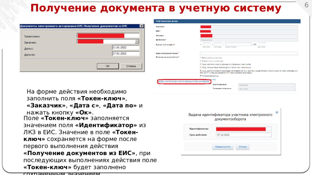 Получение документа в учетную систему Январь 2020 На форме действия необходимо заполнить поля « Токен-ключ », «Заказчик», «Дата с», «Дата по» и нажать кнопку « Ок ». Поле « Токен-ключ » заполняется значением поля «Идентификатор» из ЛКЗ в ЕИС. Значение в поле « Токен-ключ » сохраняется на форме после первого выполнения действия «Получение документов из ЕИС», при последующих выполнениях действия поле « Токен-ключ » будет заполнено сохраненным значением.