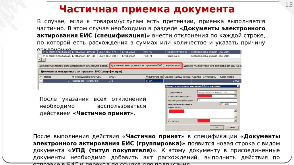 Частичная приемка документа Январь 2020 После указания всех отклонений необходимо воспользоваться действием «Частично принят». В случае, если к товарам/услугам есть претензии, приемка выполняется частично. В этом случае необходимо в разделе «Документы электронного актирования ЕИС (спецификация)» внести отклонения по каждой строке, по которой есть расхождения в суммах или количестве и указать причину отклонения. После выполнения действия «Частично принят» в спецификации «Документы электронного актирования ЕИС (группировка)» появится новая строка с видом документа «УПД (титул покупателя)». К этому документу в присоединенные документы необходимо добавить акт расхождений, выполнить действия по отправке в ЕИС и переход по ссылке для подписания.