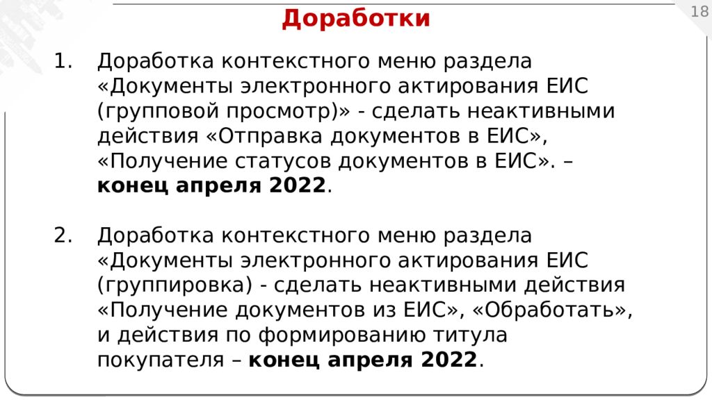 Доработки Доработка контекстного меню раздела «Документы электронного актирования ЕИС (групповой просмотр)» - сделать неактивными действия «Отправка документов в ЕИС», «Получение статусов документов в ЕИС». – конец апреля 2022. Доработка контекстного меню раздела «Документы электронного актирования ЕИС (группировка) - сделать неактивными действия «Получение документов из ЕИС», «Обработать», и действия по формированию титула покупателя – конец апреля 2022. Разработка пользовательской процедуры «Просмотр реквизитов поставщика» для раздела «Документы электронного актирования ЕИС (групповой просмотр)» – конец апреля 2022.