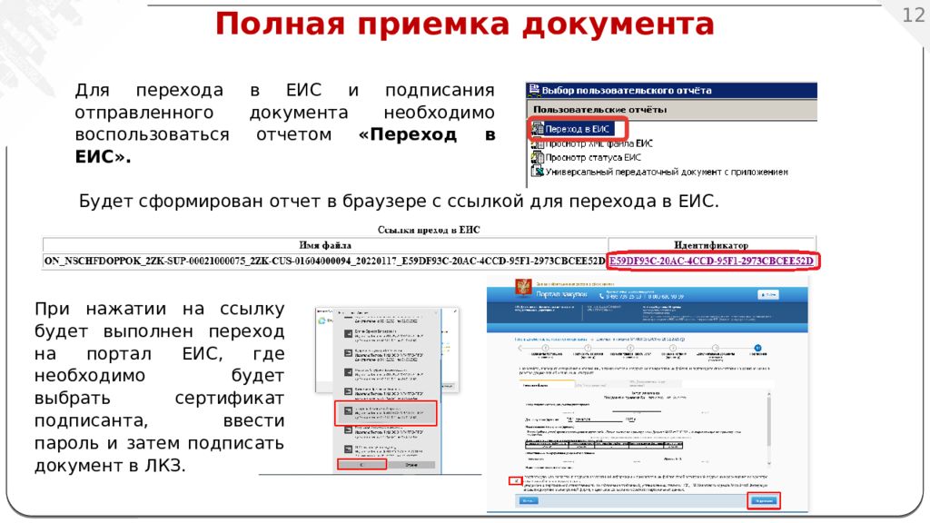 Полная приемка документа Январь 2020 Для перехода в ЕИС и подписания отправленного документа необходимо воспользоваться отчетом «Переход в ЕИС». Будет сформирован отчет в браузере с ссылкой для перехода в ЕИС. При нажатии на ссылку будет выполнен переход на портал ЕИС, где необходимо будет выбрать сертификат подписанта, ввести пароль и затем подписать документ в ЛКЗ.