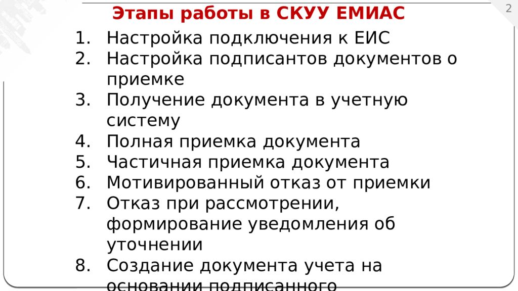 Этапы работы в СКУУ ЕМИАС Январь 2020 Настройка подключения к ЕИС Настройка подписантов документов о приемке Получение документа в учетную систему Полная приемка документа Частичная приемка документа Мотивированный отказ от приемки Отказ при рассмотрении, формирование уведомления об уточнении Создание документа учета на основании подписанного электронного документа УПД Типовые ошибки Планируемые доработки