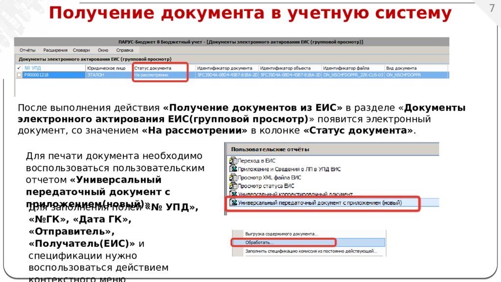 Получение документа в учетную систему Январь 2020 Для заполнения полей «№ УПД», «№ГК», «Дата ГК», «Отправитель», «Получатель(ЕИС)» и спецификации нужно воспользоваться действием контекстного меню «Обработать». После выполнения действия «Получение документов из ЕИС» в разделе « Документы электронного актирования ЕИС(групповой просмотр) » появится электронный документ, со значением «На рассмотрении» в колонке «Статус документа». Для печати документа необходимо воспользоваться пользовательским отчетом «Универсальный передаточный документ с приложением(новый)».