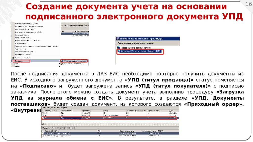 Создание документа учета на основании подписанного электронного документа УПД Январь 2020 После подписания документа в ЛКЗ ЕИС необходимо повторно получить документы из ЕИС. У исходного загруженного документа «УПД (титул продавца)» статус поменяется на «Подписано» и будет загружена запись «УПД (титул покупателя)» с подписью заказчика. После этого можно создать документ учета выполнив процедуру «Загрузка УПД из журнала обмена с ЕИС». В результате, в разделе «УПД. Документы поставщиков» будет создан документ, из которого создаются «Приходный ордер», «Внутренний документ», «Денежное обязательство».