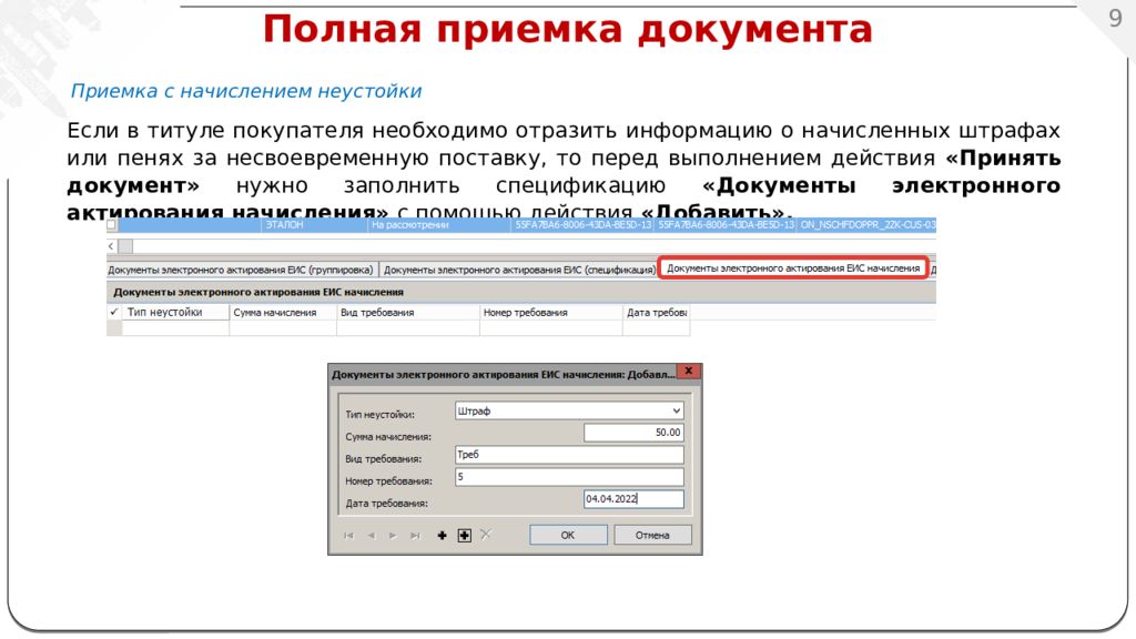 Если в титуле покупателя необходимо отразить информацию о начисленных штрафах или пенях за несвоевременную поставку, то перед выполнением действия «Принять документ» нужно заполнить спецификацию «Документы электронного актирования начисления» с помощью действия «Добавить». Полная приемка документа Приемка с начислением неустойки