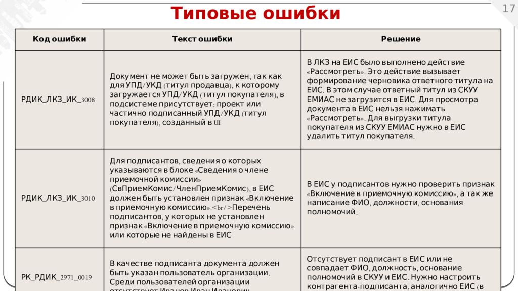Типовые ошибки Код ошибки Текст ошибки Решение РДИК_ЛКЗ_ИК_3008 Документ не может быть загружен, так как для УПД/УКД (титул продавца), к которому загружается УПД/УКД (титул покупателя), в подсистеме присутствует: проект или частично подписанный УПД/УКД (титул покупателя), созданный в UI В ЛКЗ на ЕИС было выполнено действие «Рассмотреть». Это действие вызывает формирование черновика ответного титула на ЕИС. В этом случае ответный титул из СКУУ ЕМИАС не загрузится в ЕИС. Для просмотра документа в ЕИС нельзя нажимать «Рассмотреть». Для выгрузки титула покупателя из СКУУ ЕМИАС нужно в ЕИС удалить титул покупателя. РДИК_ЛКЗ_ИК_3010 Для подписантов, сведения о которых указываются в блоке «Сведения о члене приемочной комиссии» ( СвПриемКомис / ЧленПриемКомис ), в ЕИС должен быть установлен признак «Включение в приемочную комиссию».< br />Перечень подписантов, у которых не установлен признак «Включение в приемочную комиссию» или которые не найдены в ЕИС В ЕИС у подписантов нужно проверить признак «Включение в приемочную комиссию », а так же написание ФИО, должности, основания полномочий. РК_РДИК_2971_0019 В качестве подписанта документа должен быть указан пользователь организации. Среди пользователей организации отсутствует Иванов Иван Иванович Отсутствует подписант в ЕИС или не совпадает ФИО, должность, основание полномочий в СКУУ и ЕИС. Нужно настроить контрагента-подписанта, аналогично ЕИС (в т.ч. регистр символов)