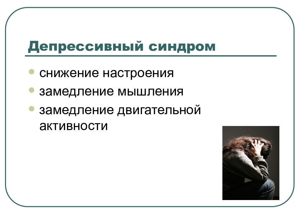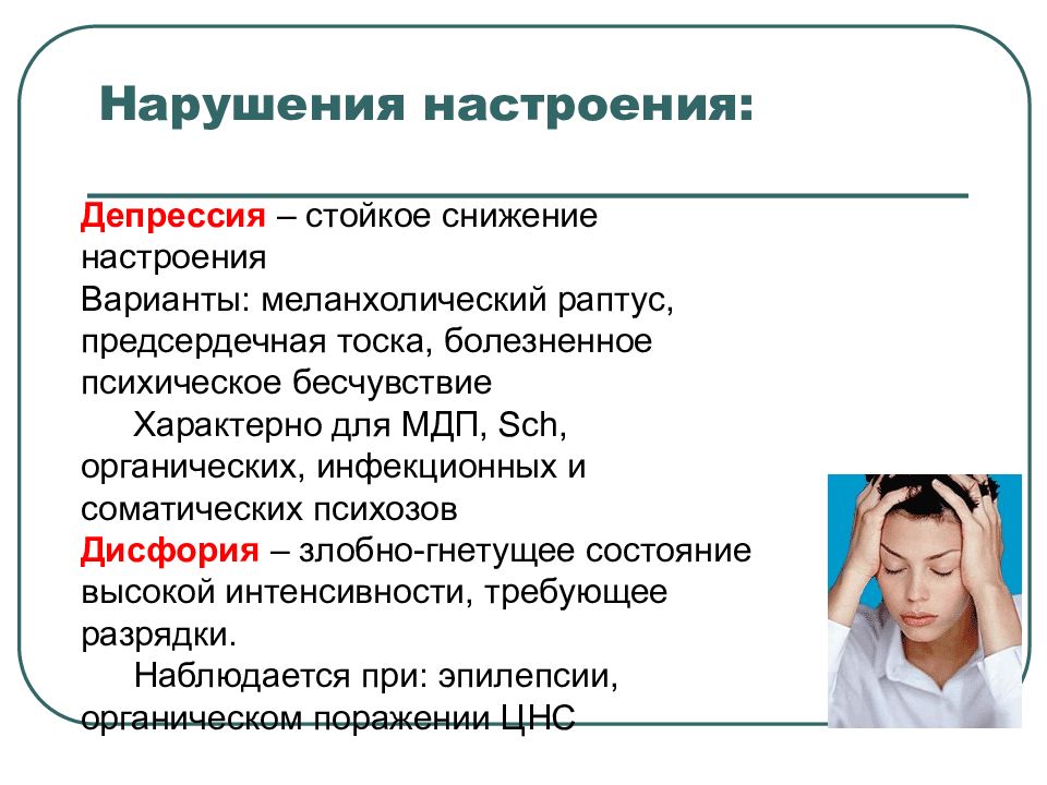 Депрессия – стойкое снижение настроения Варианты: меланхолический раптус, предсердечная тоска, болезненное психическое бесчувствие Характерно для МДП, Sch, органических, инфекционных и соматических психозов Дисфория – злобно-гнетущее состояние высокой интенсивности, требующее разрядки. Наблюдается при: эпилепсии, органическом поражении ЦНС