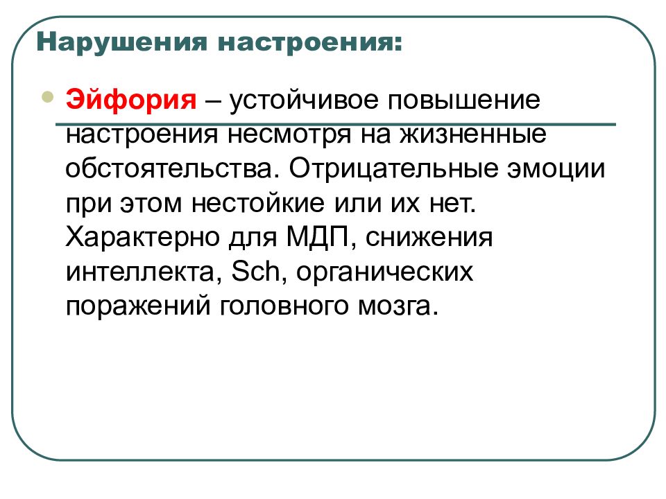 Эйфория – устойчивое повышение настроения несмотря на жизненные обстоятельства. Отрицательные эмоции при этом нестойкие или их нет. Характерно для МДП, снижения интеллекта, Sch, органических поражений головного мозга.