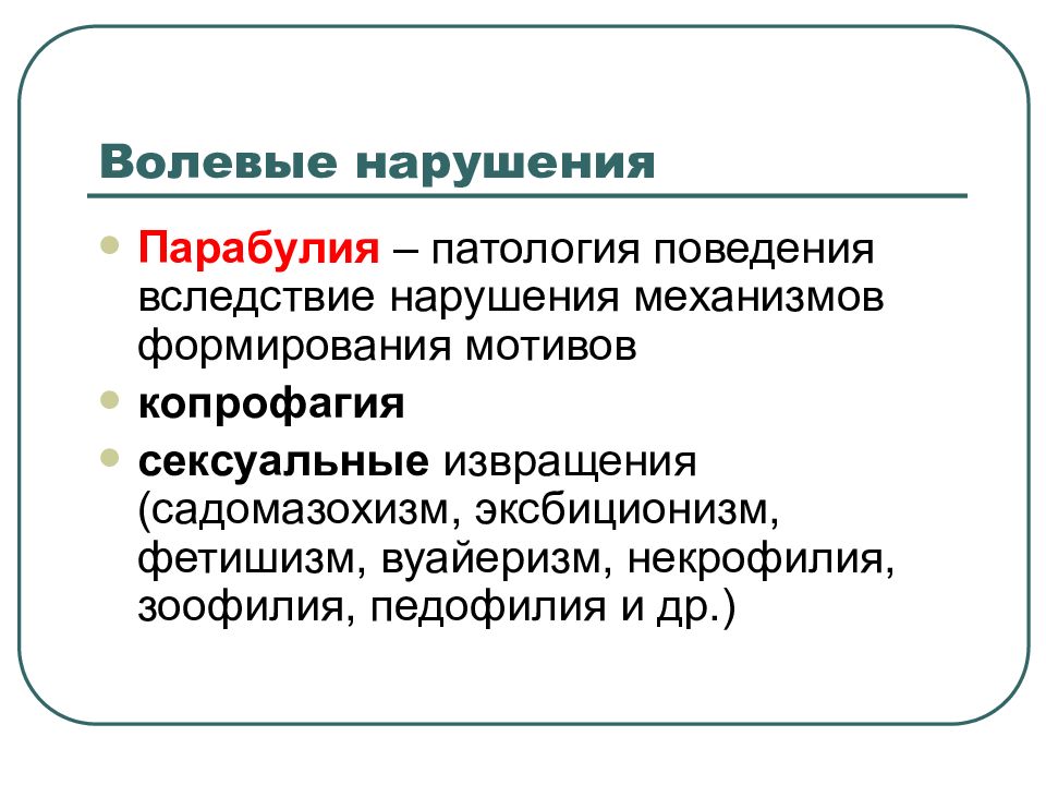 Парабулия – патология поведения вследствие нарушения механизмов формирования мотивов копрофагия сексуальные извращения (садомазохизм, эксбиционизм, фетишизм, вуайеризм, некрофилия, зоофилия, педофилия и др.)