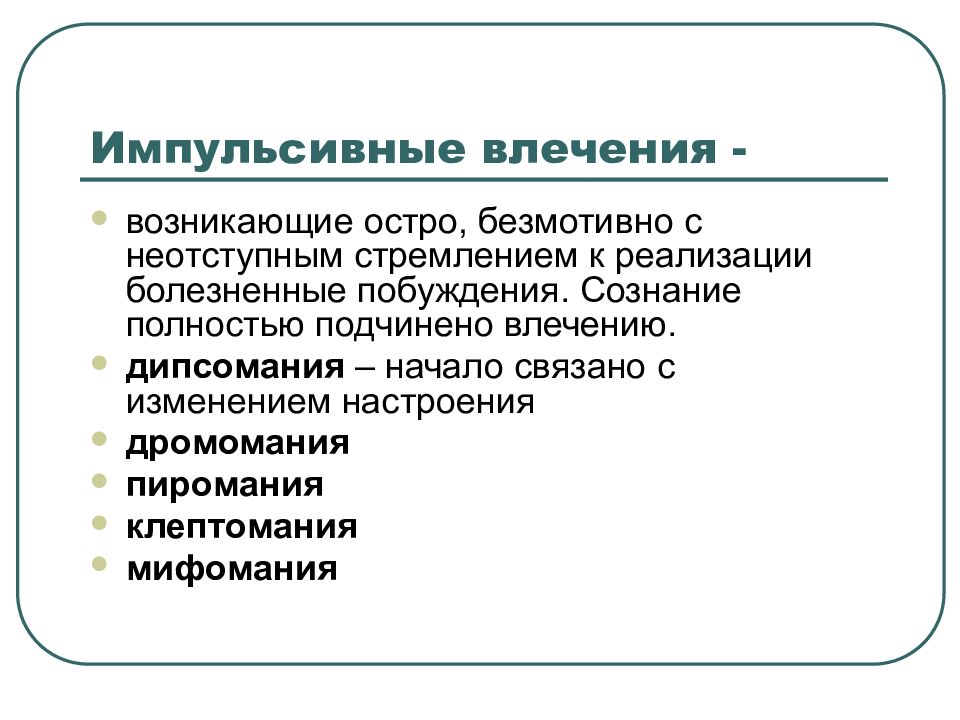 возникающие остро, безмотивно с неотступным стремлением к реализации болезненные побуждения. Сознание полностью подчинено влечению. дипсомания – начало связано с изменением настроения дромомания пиромания клептомания мифомания