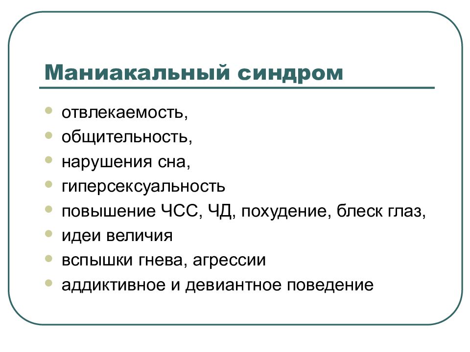 отвлекаемость, общительность, нарушения сна, гиперсексуальность повышение ЧСС, ЧД, похудение, блеск глаз, идеи величия вспышки гнева, агрессии аддиктивное и девиантное поведение