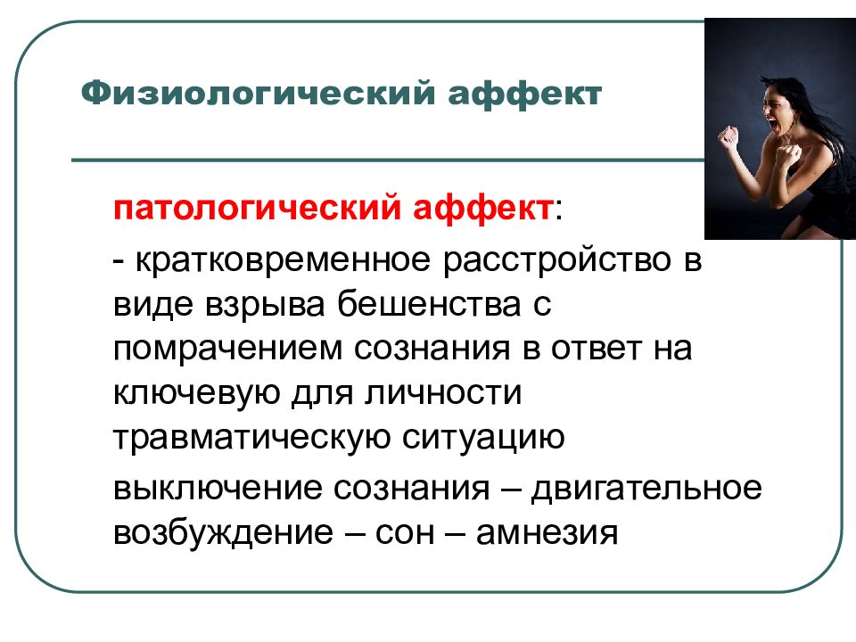 патологический аффект : - кратковременное расстройство в виде взрыва бешенства с помрачением сознания в ответ на ключевую для личности травматическую ситуацию выключение сознания – двигательное возбуждение – сон – амнезия