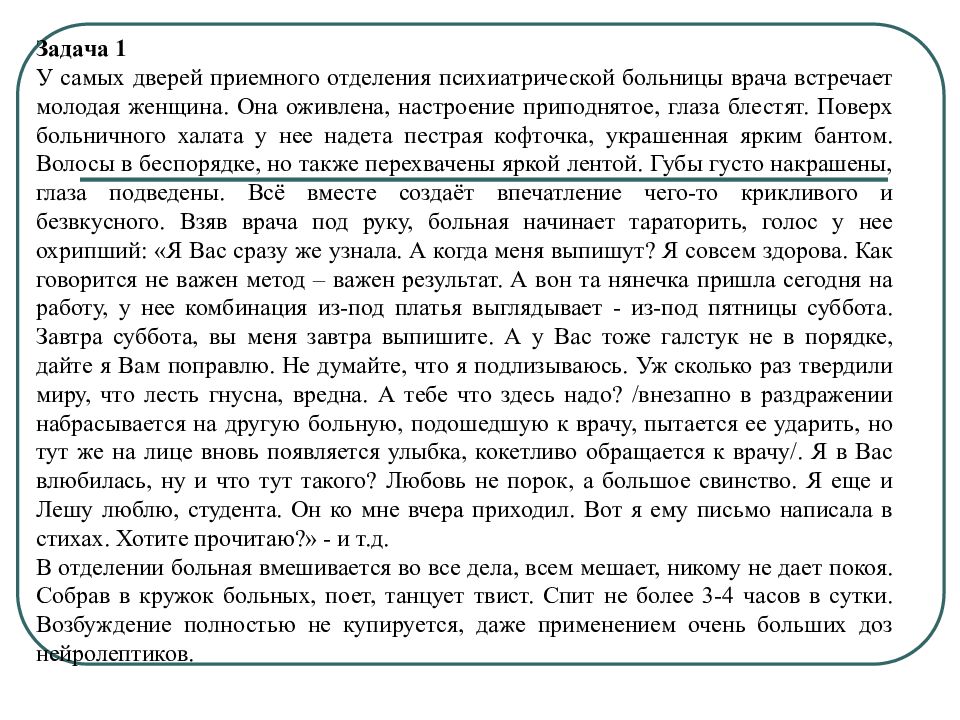 Задача 1 У самых дверей приемного отделения психиатрической больницы врача встречает молодая женщина. Она оживлена, настроение приподнятое, глаза блестят. Поверх больничного халата у нее надета пестрая кофточка, украшенная ярким бантом. Волосы в беспорядке, но также перехвачены яркой лентой. Губы густо накрашены, глаза подведены. Всё вместе создаёт впечатление чего-то крикливого и безвкусного. Взяв врача под руку, больная начинает тараторить, голос у нее охрипший: «Я Вас сразу же узнала. А когда меня выпишут? Я совсем здорова. Как говорится не важен метод – важен результат. А вон та нянечка пришла сегодня на работу, у нее комбинация из-под платья выглядывает - из-под пятницы суббота. Завтра суббота, вы меня завтра выпишите. А у Вас тоже галстук не в порядке, дайте я Вам поправлю. Не думайте, что я подлизываюсь. Уж сколько раз твердили миру, что лесть гнусна, вредна. А тебе что здесь надо? /внезапно в раздражении набрасывается на другую больную, подошедшую к врачу, пытается ее ударить, но тут же на лице вновь появляется улыбка, кокетливо обращается к врачу/. Я в Вас влюбилась, ну и что тут такого? Любовь не порок, а большое свинство. Я еще и Лешу люблю, студента. Он ко мне вчера приходил. Вот я ему письмо написала в стихах. Хотите прочитаю?» - и т.д. В отделении больная вмешивается во все дела, всем мешает, никому не дает покоя. Собрав в кружок больных, поет, танцует твист. Спит не более 3-4 часов в сутки. Возбуждение полностью не купируется, даже применением очень больших доз нейролептиков.