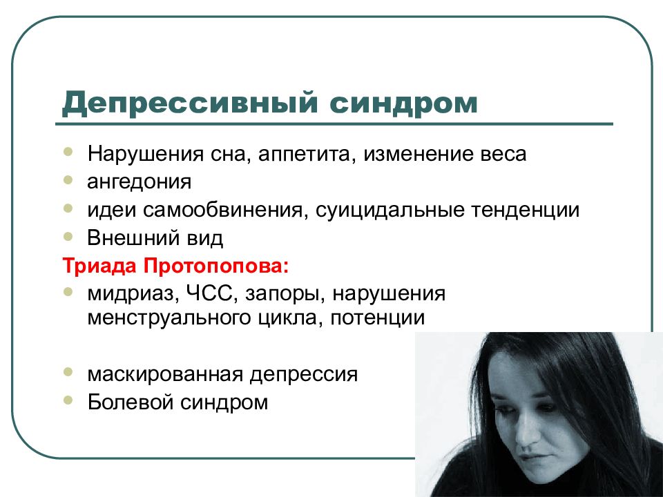 Нарушения сна, аппетита, изменение веса ангедония идеи самообвинения, суицидальные тенденции Внешний вид Триада Протопопова: мидриаз, ЧСС, запоры, нарушения менструального цикла, потенции маскированная депрессия Болевой синдром