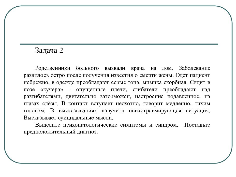 Задача 2 Родственники больного вызвали врача на дом. Заболевание развилось остро после получения известия о смерти жены. Одет пациент небрежно, в одежде преобладают серые тона, мимика скорбная. Сидит в позе «кучера» - опущенные плечи, сгибатели преобладают над разгибателями, двигательно заторможен, настроение подавленное, на глазах слёзы. В контакт вступает неохотно, говорит медленно, тихим голосом. В высказываниях «звучит» психотравмирующая ситуация. Высказывает суицидальные мысли. Выделите психопатологические симптомы и синдром. Поставьте предположительный диагноз.