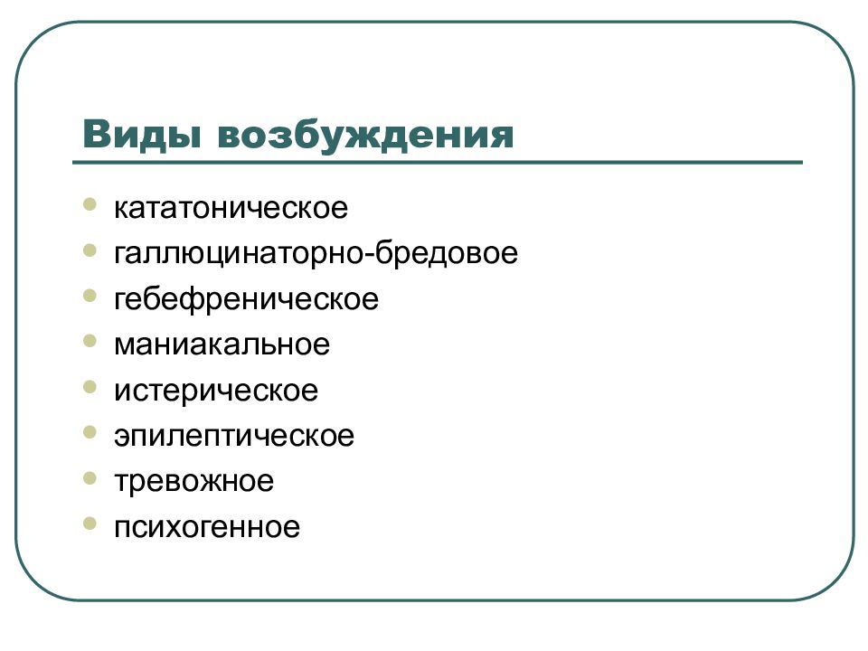 кататоническое галлюцинаторно-бредовое гебефреническое маниакальное истерическое эпилептическое тревожное психогенное