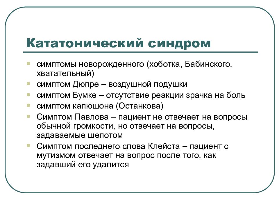 симптомы новорожденного (хоботка, Бабинского, хватательный) симптом Дюпре – воздушной подушки симптом Бумке – отсутствие реакции зрачка на боль симптом капюшона (Останкова) Симптом Павлова – пациент не отвечает на вопросы обычной громкости, но отвечает на вопросы, задаваемые шепотом Симптом последнего слова Клейста – пациент с мутизмом отвечает на вопрос после того, как задавший его удалится