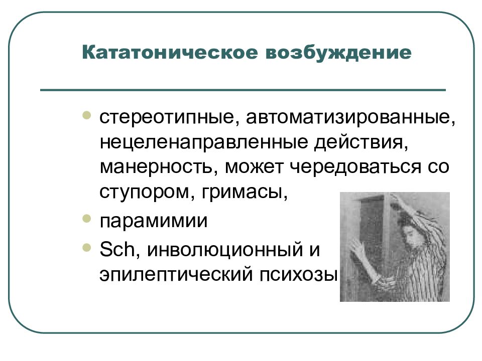 стереотипные, автоматизированные, нецеленаправленные действия, манерность, может чередоваться со ступором, гримасы, парамимии Sch, инволюционный и эпилептический психозы