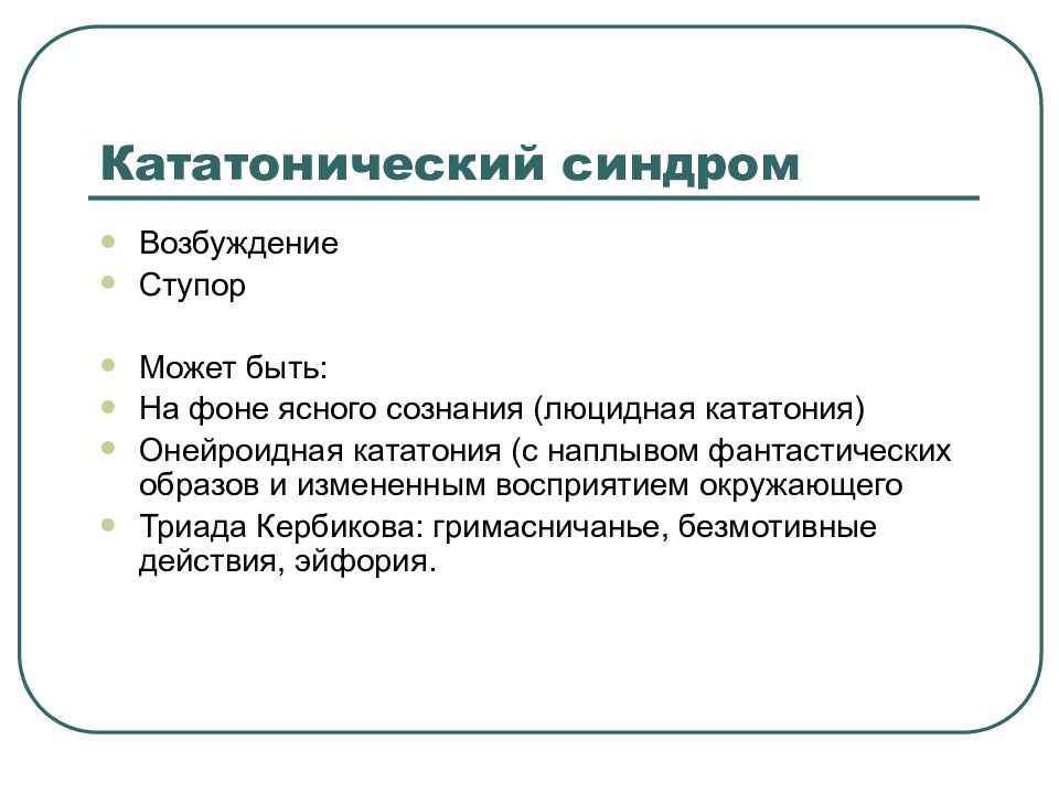 Возбуждение Ступор Может быть: На фоне ясного сознания (люцидная кататония) Онейроидная кататония (с наплывом фантастических образов и измененным восприятием окружающего Триада Кербикова: гримасничанье, безмотивные действия, эйфория.