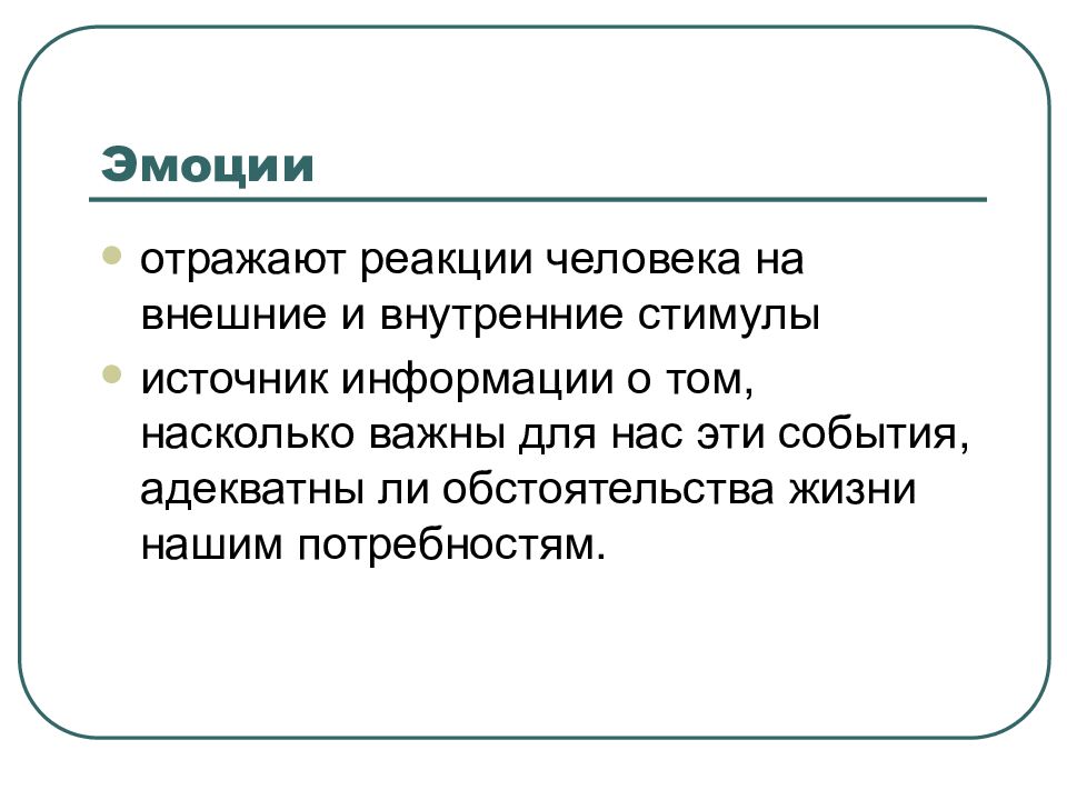 отражают реакции человека на внешние и внутренние стимулы источник информации о том, насколько важны для нас эти события, адекватны ли обстоятельства жизни нашим потребностям.