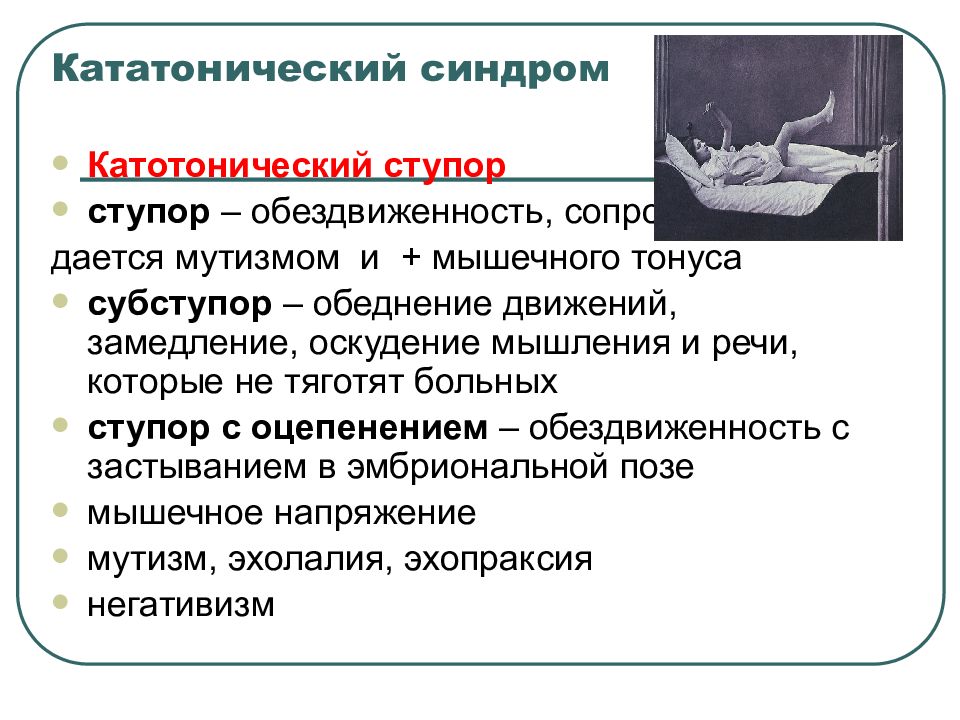 Катотонический ступор ступор – обездвиженность, сопровож- дается мутизмом и + мышечного тонуса субступор – обеднение движений, замедление, оскудение мышления и речи, которые не тяготят больных ступор с оцепенением – обездвиженность с застыванием в эмбриональной позе мышечное напряжение мутизм, эхолалия, эхопраксия негативизм