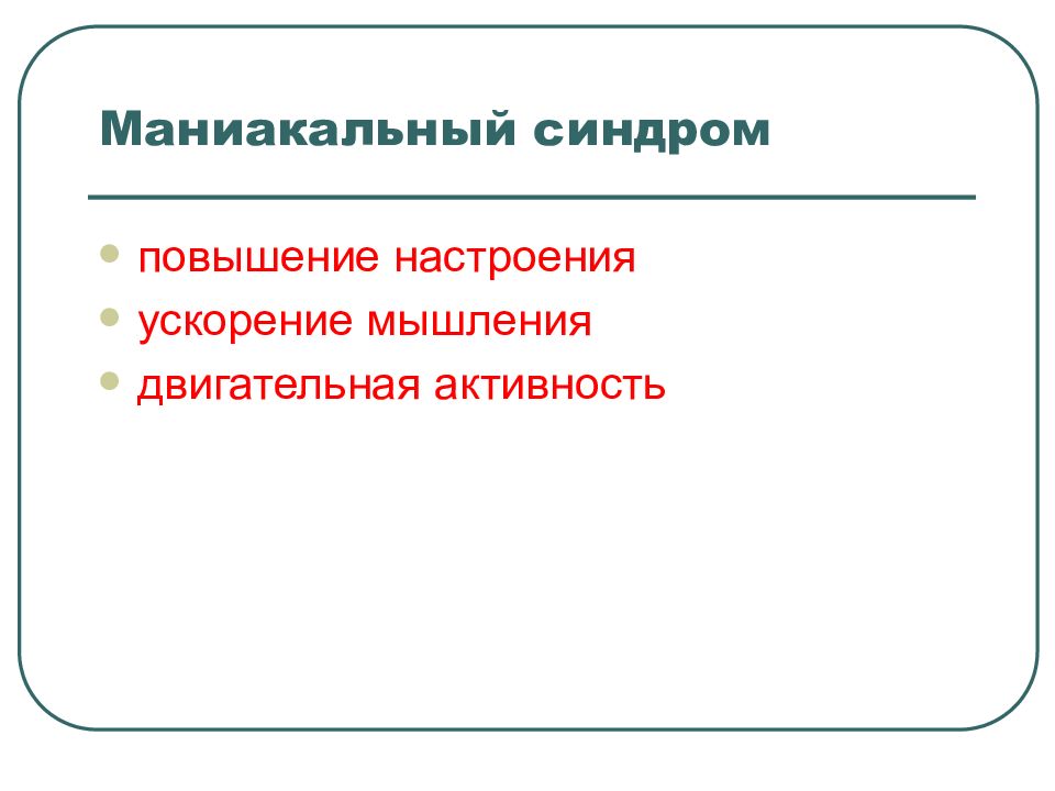 Гипербулия – избыточная активность с импульсивным стремлением к немедленному достижению цели Гипересексуальность, Полидипсия Расторможенность низших влечений (при маниак., Sch, эпилепсии, умственной отсталости, невротических расстройствах)
