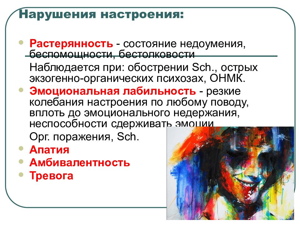 Растерянность - состояние недоумения, беспомощности, бестолковости Наблюдается при: обострении Sch., острых экзогенно-органических психозах, ОНМК. Эмоциональная лабильность - резкие колебания настроения по любому поводу, вплоть до эмоционального недержания, неспособности сдерживать эмоции Орг. поражения, Sch. Апатия Амбивалентность Тревога