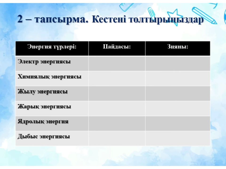 Последний слайд презентации: Энергияның түрленуі Оқу мақсаты: энергияның түрленуіне мысалдар келтіру