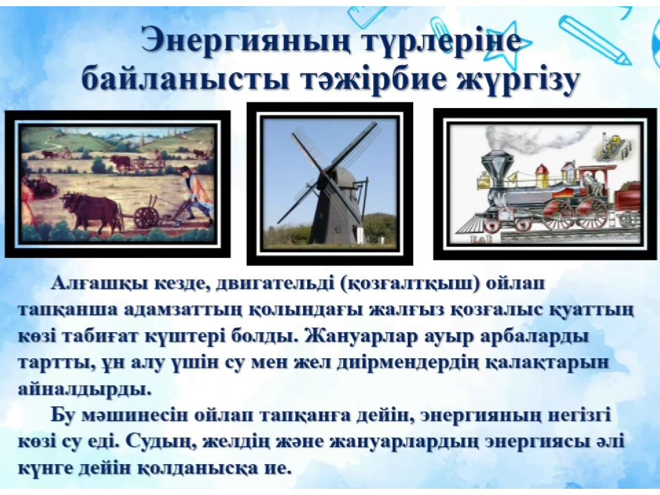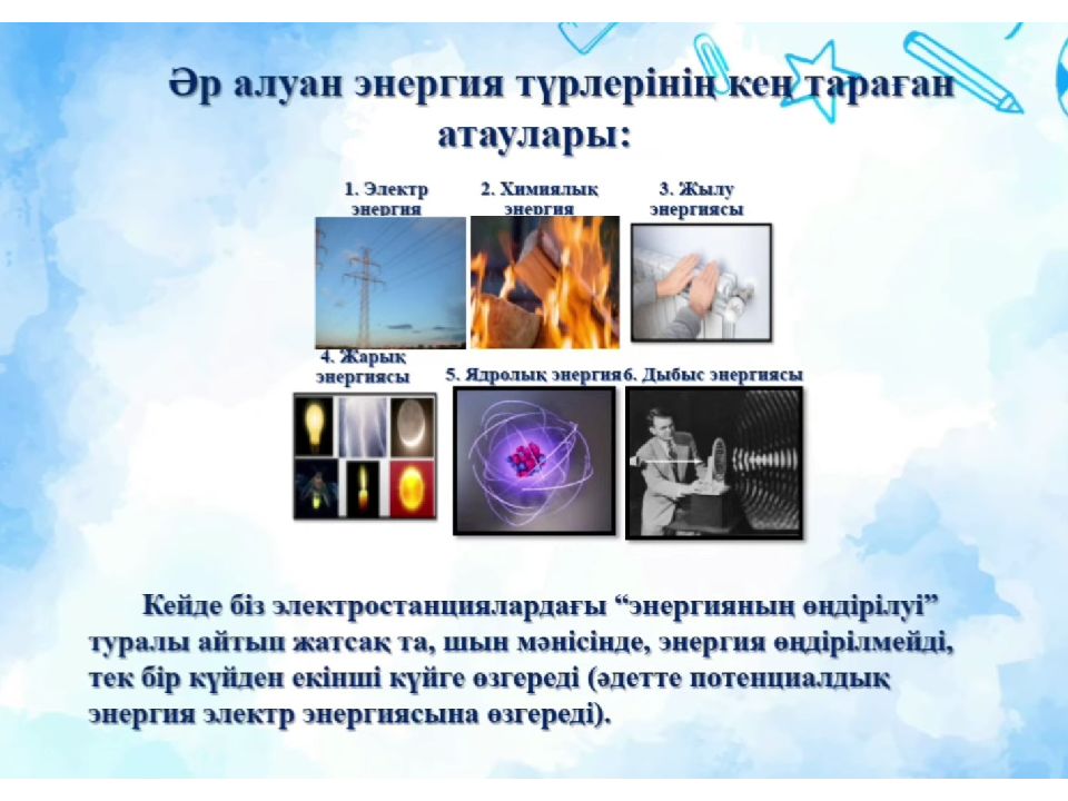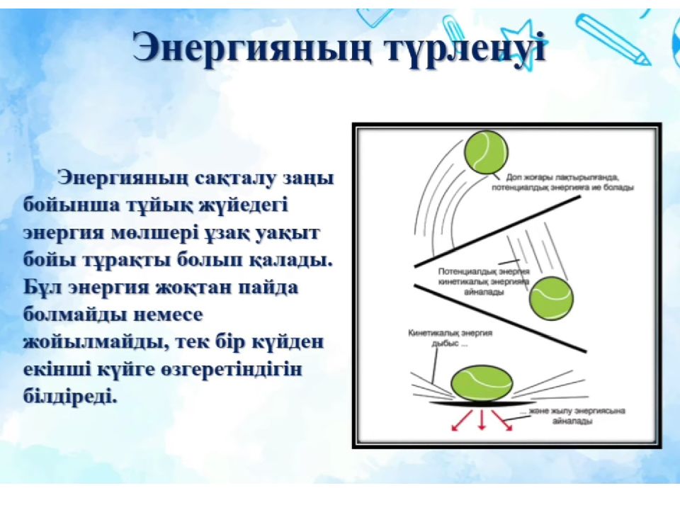 Энергияның түрленуі Оқу мақсаты: энергияның түрленуіне мысалдар келтіру