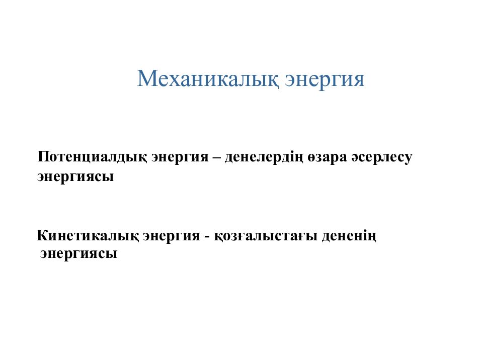 Механикалық энергия Потенциалдық энергия – денелердің өзара әсерлесу энергиясы Кинетикалық энергия - қозғалыстағы дененің энергиясы