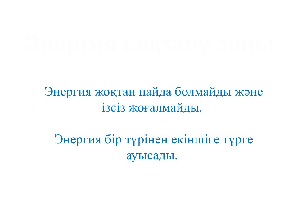 Энергия жоқтан пайда болмайды және ізсіз жоғалмайды. Энергия бір түрінен екіншіге түрге ауысады. Энергия са қ талу заңы