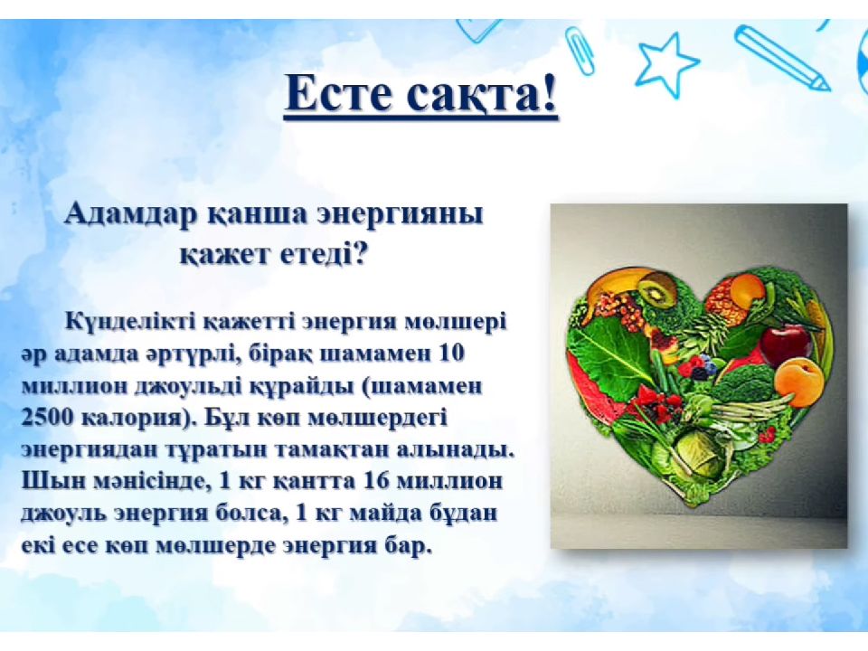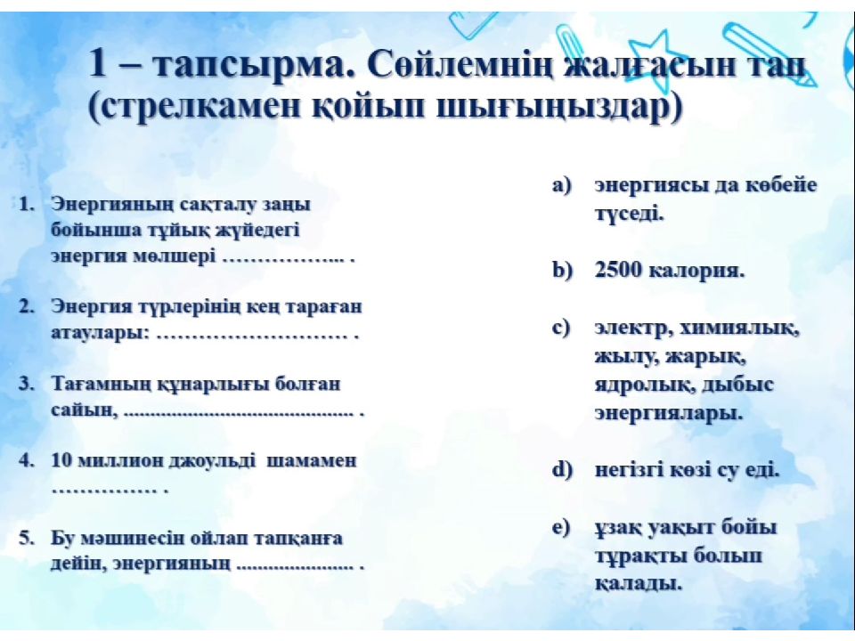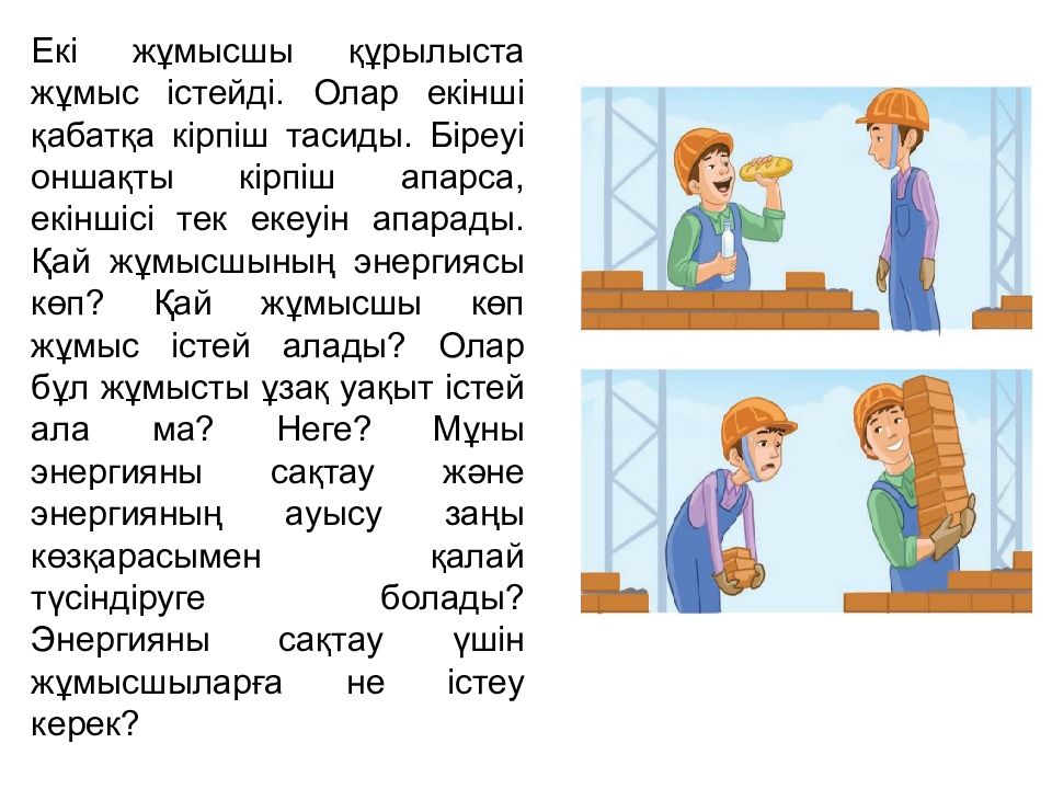 Екі жұмысшы құрылыста жұмыс істейді. Олар екінші қабатқа кірпіш тасиды. Біреуі оншақты кірпіш апарса, екіншісі тек екеуін апарады. Қай жұмысшының энергиясы көп ? Қай жұмысшы көп жұмыс істей алады ? Олар бұл жұмысты ұзақ уақыт істей ала ма ? Неге? Мұны энергияны сақтау және энергияның ауысу заңы көзқарасымен қалай түсіндіруге болады ? Энергияны сақтау үшін жұмысшыларға не істеу керек?