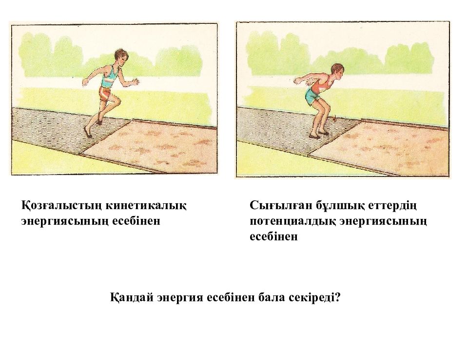 Қандай энергия есебінен бала секіреді? Қозғалыстың кинетикалық энергиясының есебінен Сығылған бұлшық еттердің потенциалдық энергиясының есебінен