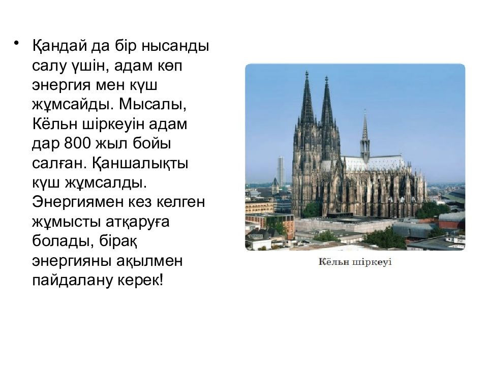 Қандай да бір нысанды салу үшін, адам көп энергия мен күш жұмсайды. Мысалы, Кёльн шіркеуін адам дар 800 жыл бойы салған. Қаншалықты күш жұмсалды. Энергиямен кез келген жұмысты атқаруға болады, бірақ энергияны ақылмен пайдалану керек!