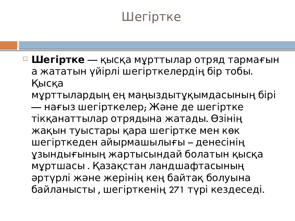 Шегіртке — қысқа мұрттылар отряд тармағына жататын үйірлі шегірткелердің бір тобы. Қысқа мұрттылардың ең маңыздытұқымдасының бірі — нағыз шегірткелер ; Және де шегіртке тікқанаттылар отрядына жатады. Өзінің жақын туыстары қара шегіртке мен көк шегірткеден айырмашылығы – денесінің ұзындығының жартысындай болатын қысқа мұртшасы. Қазақстан ландшафтасының әртүрлі және жерінің кең байтақ болуына байланысты, шегірткенің 271 түрі кездеседі.