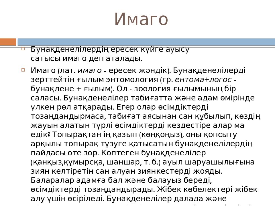 Бунақденелілердің ересек күйге ауысу сатысы имаго деп аталады. Имаго (лат. имаго - ересек жәндік ). Бунақденелілерді зерттейтін ғылым энтомология ( гр. ентома+логос - бунақдене + ғылым ). Ол - зоология ғылымының бір саласы. Бунақденелілер табиғатта және адам өмірінде үлкен рөл атқарады. Егер олар өсімдіктерді тозаңдандырмаса, табиғат аясынан сан құбылып, көздің жауын алатын түрлі өсімдіктерді кездестіре алар ма едік ? Топырақтан ің қазып (көңқоңыз ), оны қопсыту арқылы топырақ түзуге қатысатын бунақденелілердің пайдасы өте зор. Көптеген бунақденелілер (қанқыз,құмырсқа, шаншар, т. б.) ауыл шаруашылығына зиян келтіретін сан алуан зиянкестерді жояды. Баларалар адамға бал және балауыз береді, өсімдіктерді тозаңдандырады. Жібек көбелектері жібек алу үшін өсіріледі. Бунақденелілер далада және орманда қалған жануарлардың өлексесі мен өсімдіктің шірінділерімен қоректенеді. Кейбір елдерде бунақденелілерді ( шегірткені ) тағам ретінде пайдаланды. Табиғатта тіршілік ететін зиянды бунақденелілер де баршылық.
