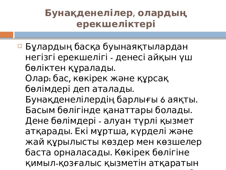 Бұлардың басқа буынаяқтылардан негізгі ерекшелігі - денесі айқын үш бөліктен құралады. Олар : бас, көкірек және құрсақ бөлімдері деп аталады. Бунақденелілердің барлығы 6 аяқты. Басым бөлігінде қанаттары болады. Дене бөлімдері - алуан түрлі қызмет атқарады. Екі мұртша, күрделі және жай құрылысты көздер мен көзшелер баста орналасады. Көкірек бөлігіне қимыл-қозғалыс қызметін атқаратын аяқтар мен қанаттар орнығады. Көбею мүшелері құрсағында болады. Бунақденелілер демтүтік (трахея) арқылы тыныс алады.