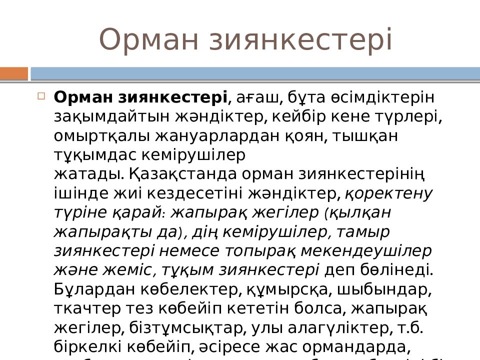 Орман зиянкестері, ағаш, бұта өсімдіктерін зақымдайтын жәндіктер, кейбір кене түрлері, омыртқалы жануарлардан қоян, тышқан тұқымдас кемірушілер жатады. Қазақстанда орман зиянкестерінің ішінде жиі кездесетіні жәндіктер, қоректену түріне қарай: жапырақ жегілер (қылқан жапырақты да), дің кемірушілер, тамыр зиянкестері немесе топырақ мекендеушілер және жеміс, тұқым зиянкестері деп бөлінеді. Бұлардан көбелектер, құмырсқа, шыбындар, ткачтер тез көбейіп кететін болса, жапырақ жегілер, бізтұмсықтар, улы алагүліктер, т.б. біркелкі көбейіп, әсіресе жас ормандарда, саябақтарда, егін қорғау алқабында белгілі бір аймақта таралады.
