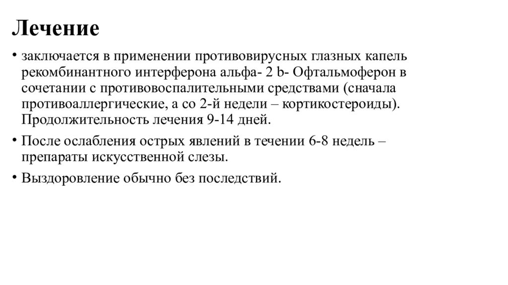 заключается в применении противовирусных глазных капель рекомбинантного интерферона альфа- 2 b- Офтальмоферон в сочетании с противовоспалительными средствами (сначала противоаллергические, а со 2-й недели – кортикостероиды). Продолжительность лечения 9-14 дней. После ослабления острых явлений в течении 6-8 недель –препараты искусственной слезы. Выздоровление обычно без последствий.