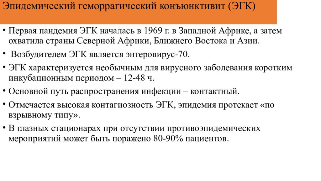 Первая пандемия ЭГК началась в 1969 г. в Западной Африке, а затем охватила страны Северной Африки, Ближнего Востока и Азии. Возбудителем ЭГК является энтеровирус-70. ЭГК характеризуется необычным для вирусного заболевания коротким инкубационным периодом – 12-48 ч. Основной путь распространения инфекции – контактный. Отмечается высокая контагиозность ЭГК, эпидемия протекает «по взрывному типу». В глазных стационарах при отсутствии противоэпидемических мероприятий может быть поражено 80-90% пациентов.