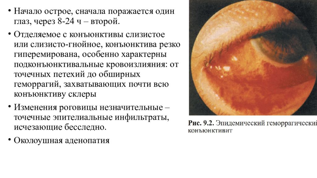 Начало острое, сначала поражается один глаз, через 8-24 ч – второй. Отделяемое с конъюнктивы слизистое или слизисто -гнойное, конъюнктива резко гиперемирована, особенно характерны подконъюнктивальные кровоизлияния: от точечных петехий до обширных геморрагий, захватывающих почти всю конъюнктиву склеры Изменения роговицы незначительные – точечные эпителиальные инфильтраты, исчезающие бесследно. Околоушная аденопатия