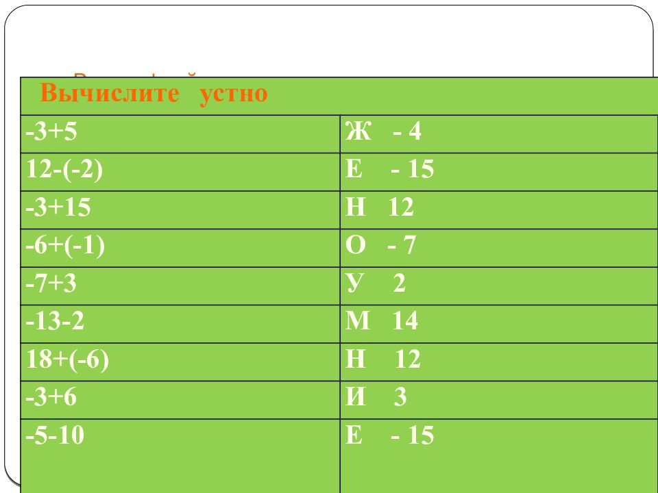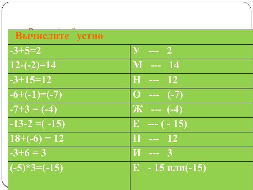Вычислите устно -3+5=2 У --- 2 12-(-2)=14 М --- 14 -3+15=12 Н --- 12 -6+(-1)=(-7) О --- (-7) -7+3 = (-4) Ж --- (-4) -13-2 =( -15) Е --- ( - 15) 18+(-6) = 12 Н --- 12 -3+6 = 3 И --- 3 (-5)*3=(-15) Е - 15 или(-15)