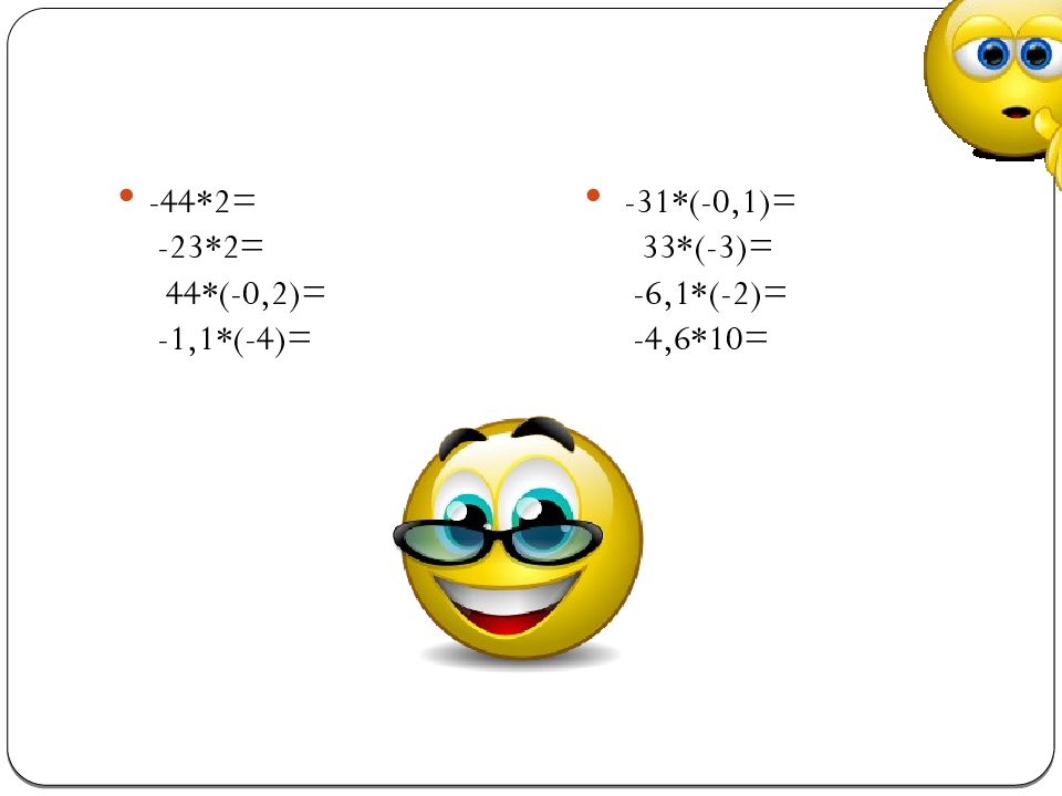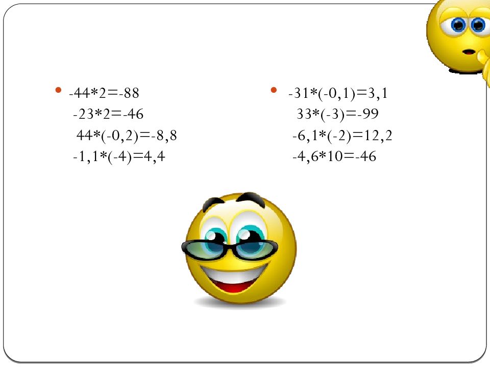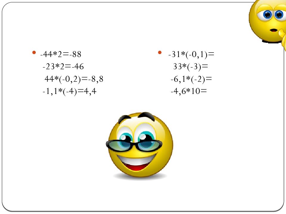 -44*2=-88 -23*2=-46 44*(-0,2)=-8,8 -1,1*(-4)=4,4 -31*(-0,1)=3,1 33*(-3)=-99 -6,1*(-2)=12,2 -4,6*10=-46