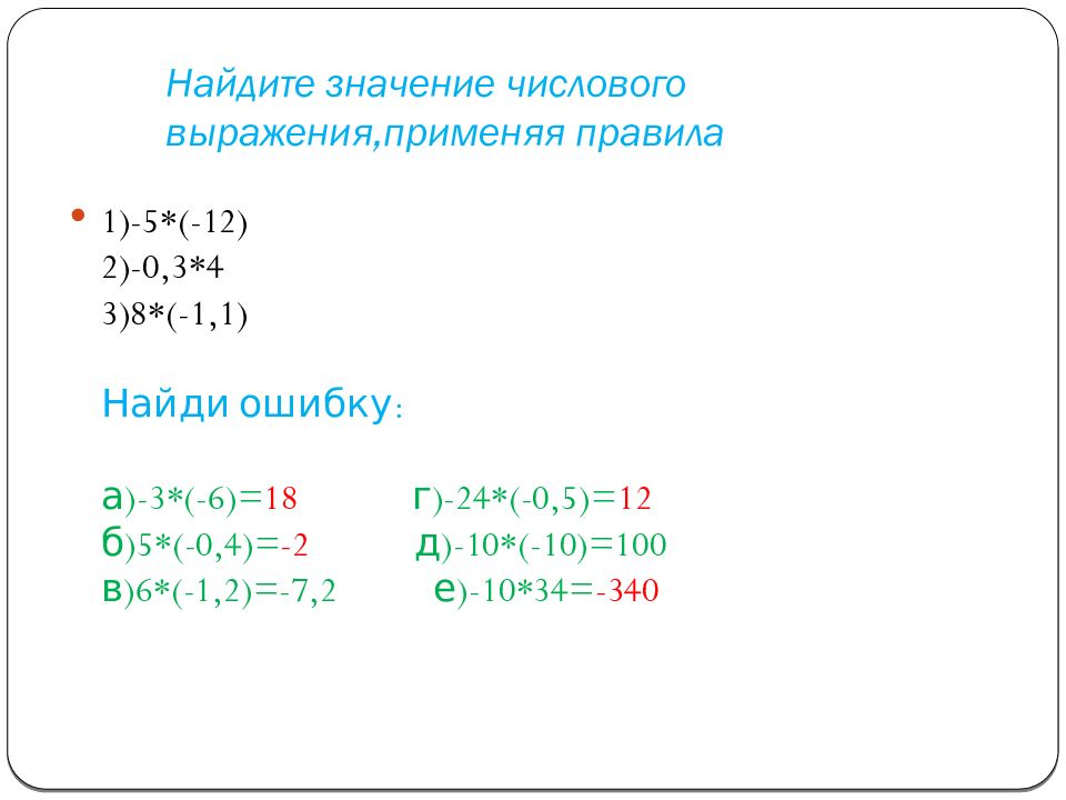 1)-5*(-12) 2)-0,3*4 3)8*(-1,1) Найди ошибку: а)-3*(-6)=-18 г)-24*(-0,5)=-12 б)5*(-0,4)=-20 д)-10*(-10)=100 в)6*(-1,2)=-7,2 е)-10*34=-3,4